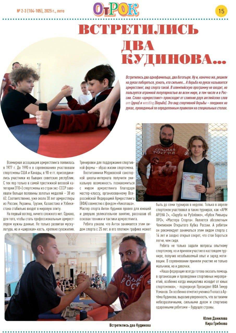Автор заметки «Встретились два Кудинова», шестиклассница Кира Грибкова, рассказала про историю этого вида спорта, знакомство воспитанников интерната с нашим волонтером – чемпионом мира по армрестлингу в супертяжелом весе Антоном Кудиновыми акцентировала внимание на том, что в товарищеской схватке с именитым спортсменом сошелся его однофамилец – ученик 9-го класса Артем Кудинов.